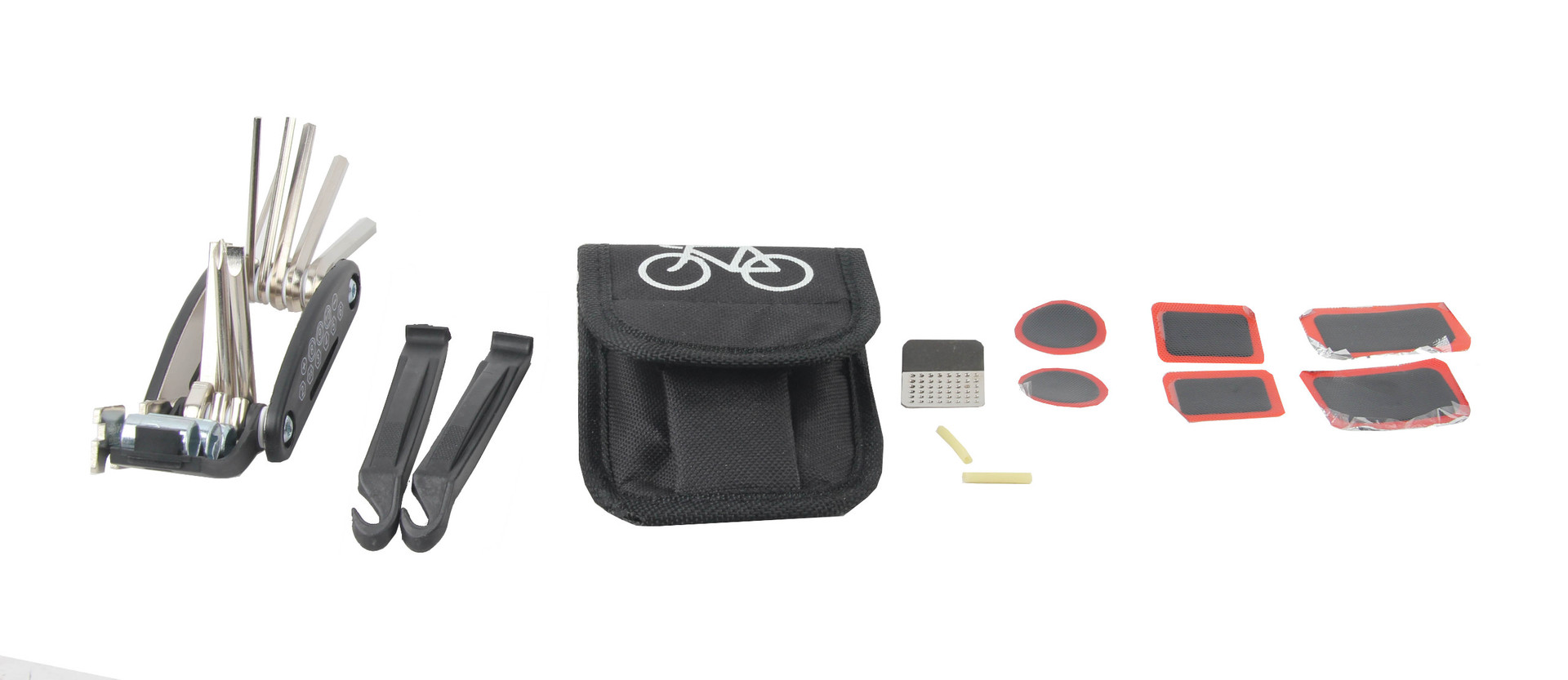 Kompletní sada opravného klíče s lepením a montpákami pro případnou opravu kola sbalená v praktické textilní tašce za výhodnou cenu