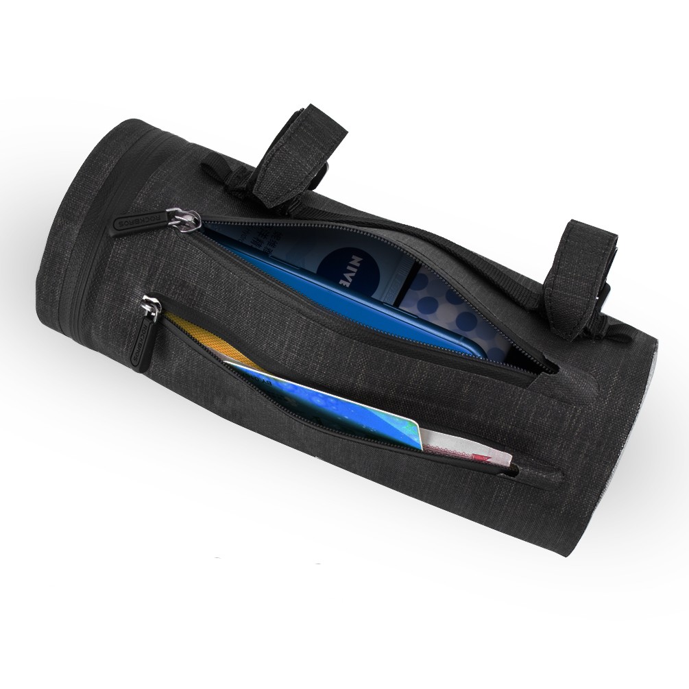 Kapsa má tři vstupy do dvou komor, shora a z boku. Kromě silikonovým psáků pro připevnění na řidítka k brašně dostanete ještě
