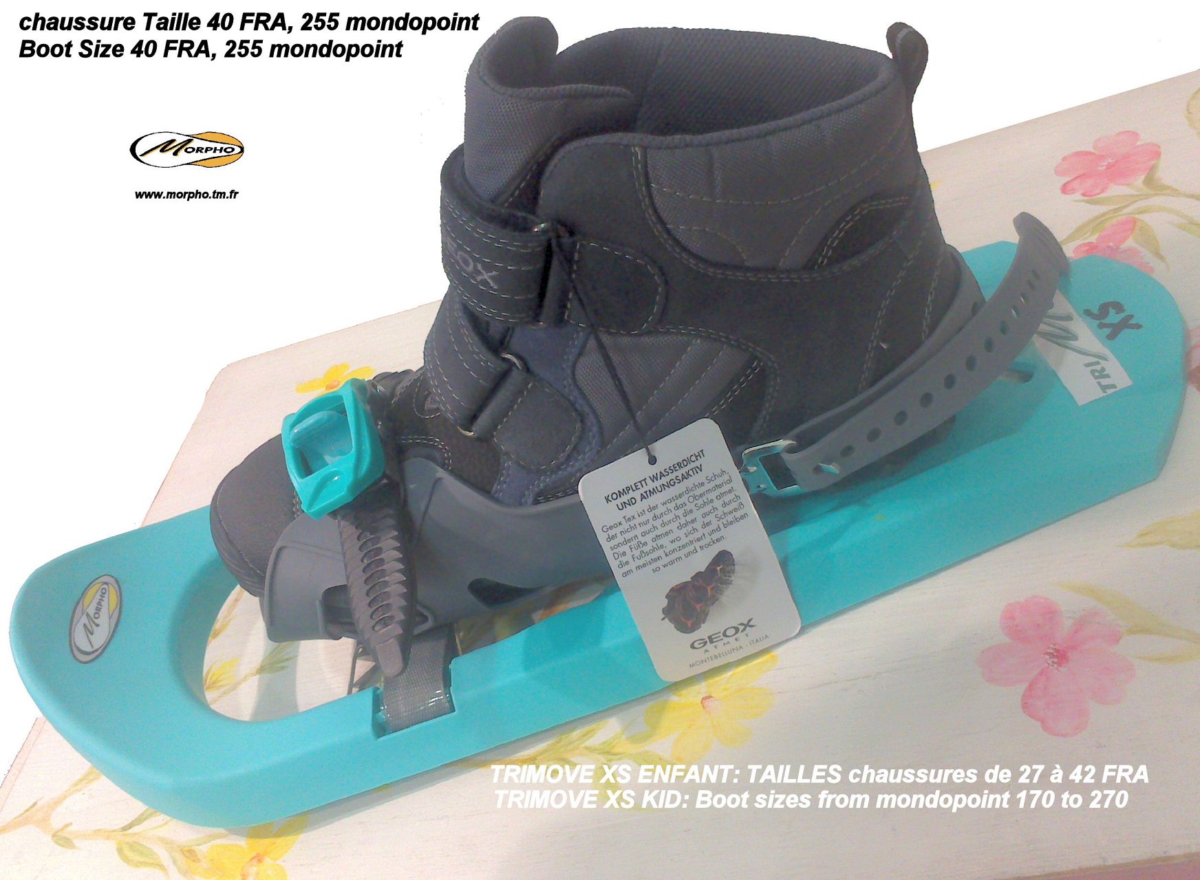 Extrémně lehká, ale spolehlivá sněžnice pro naše nejmenší! Vyrobeno ve Francii.Jednoduchá, lehká a pro děti příjemná na nošení je sněžnice Morpho KID. Velmi jednoduché usazení na nohu i pro netrpělivé děti. Nohu vložíte do předního pásku, vzadu nasadíte gumový pásek, co nejvíce stáhnete (lze jednou rukou) a vpředu dotáhnete ráčnovým systémem. Hotovo. Použitým materiálem těla sněžnice je stejně jako u vyšších modelů speciální nepřemrzající materiál, který vydrží jakékoliv dětské zacházení. Vhodné pro jakýkoliv typ bot.