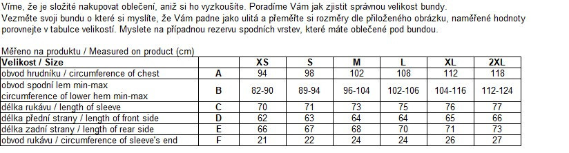 Zbytek částí bundy je vyroben z pružného jednovrstvého materiálu o hmotnosti 230g/m2 (prodyšný a voděodolný).